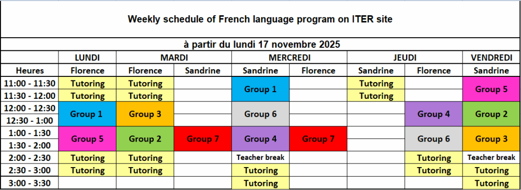 In September, the learning year starts with 6 groups (Groups 1 to 6). Later in the year, new beginner groups (Group 7 and Group 8) are open to accommodate the new complete beginners arriving at ITER.